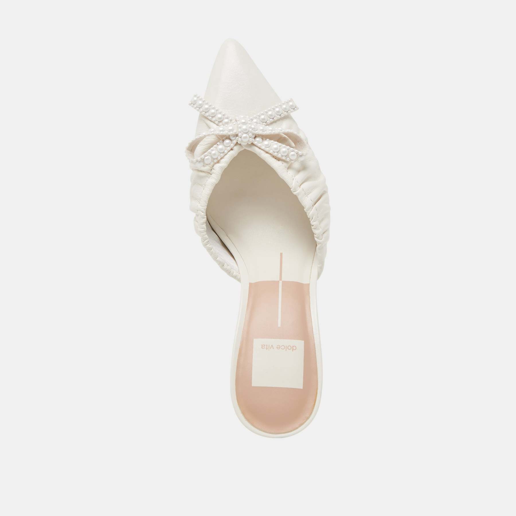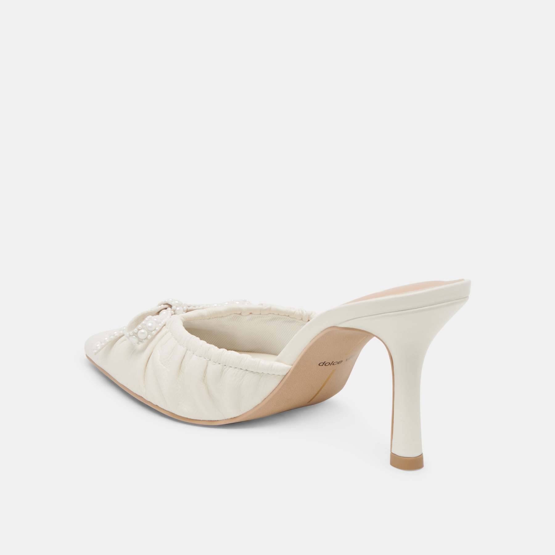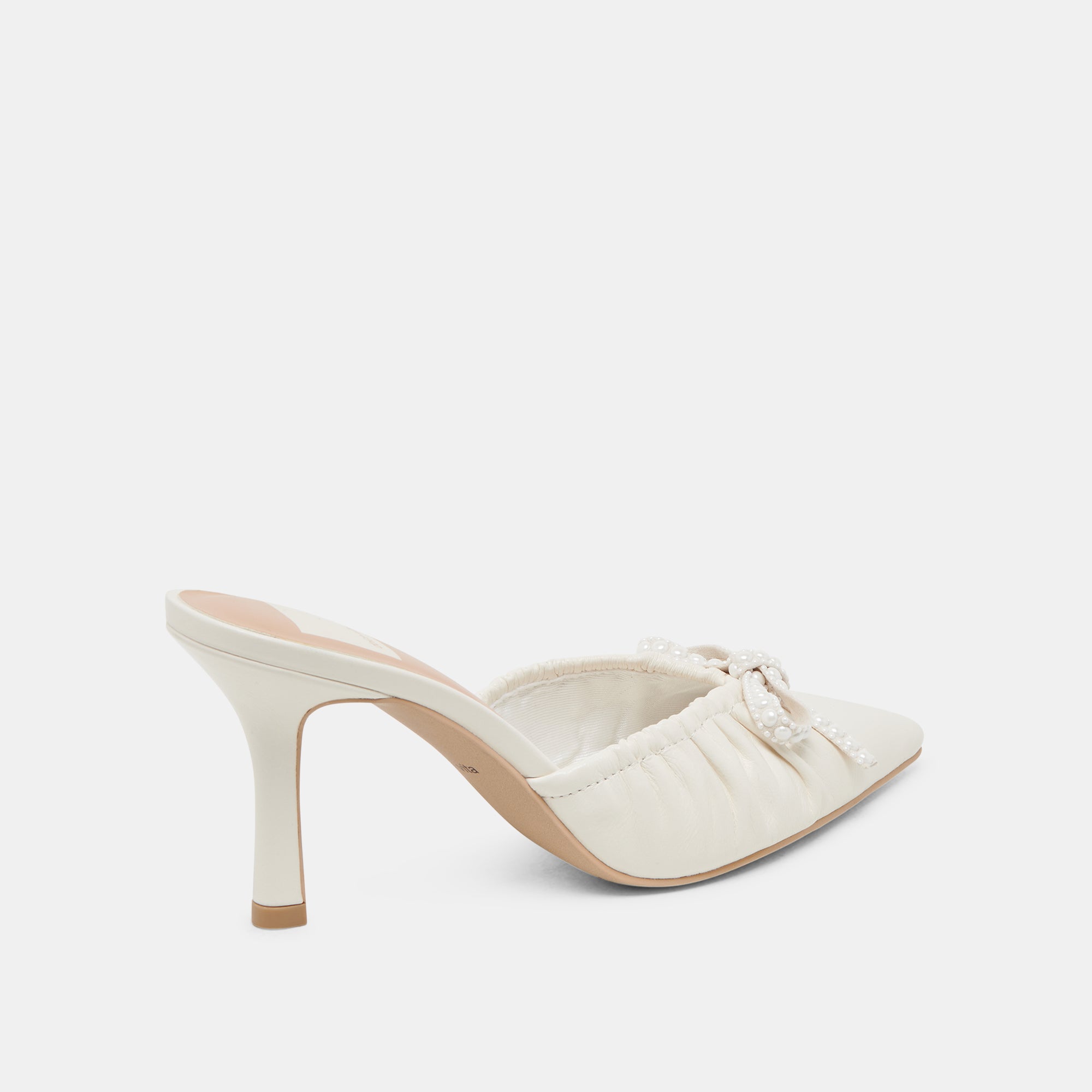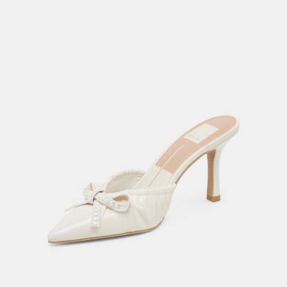 We're head over heels for KAIRI PEARL in crinkle patent. neutral tones. and a pearl encrusted bow. This chic little mule pairs well with wedding weekend looks or with denim and a matching hair bow.