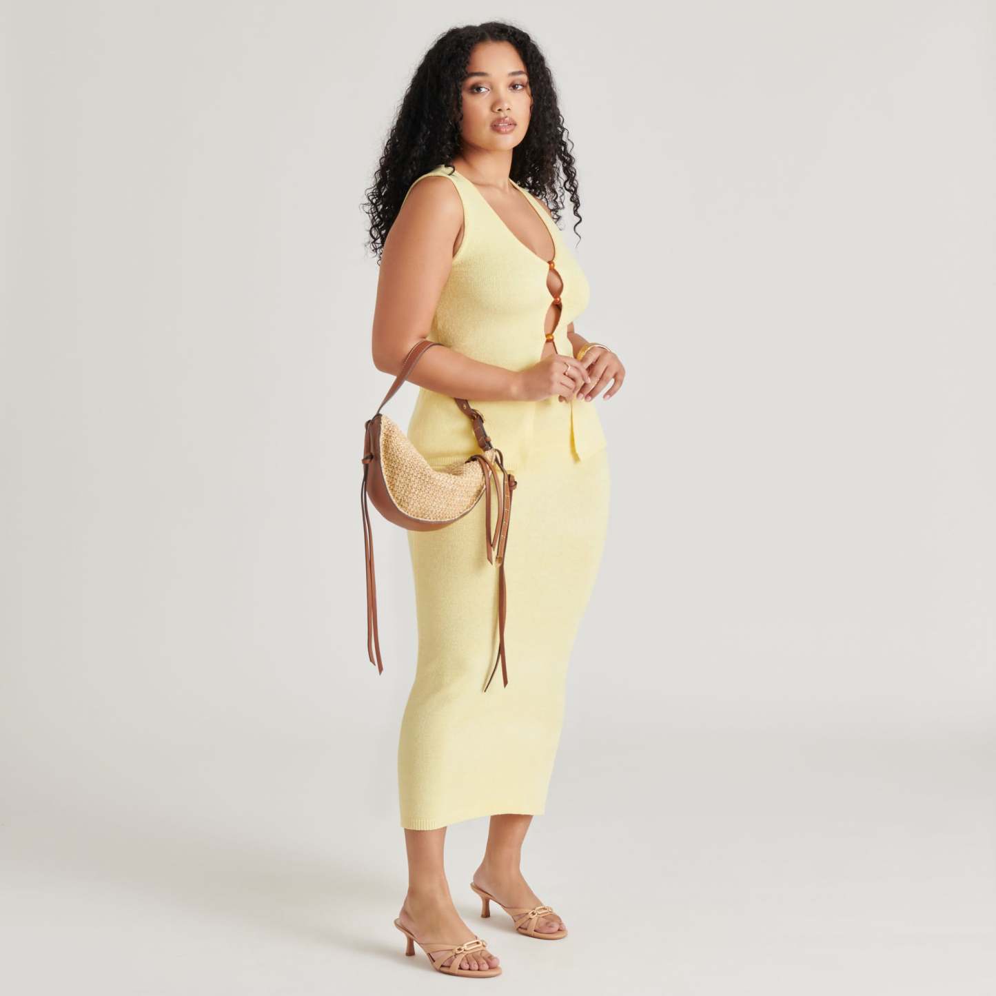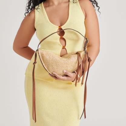 MONACO blends natural raffia and caramel brown details for an effortlessly sleek and summery shoulder bag. Her curved silhouette and adjustable strap make for an elevated everyday go-to.